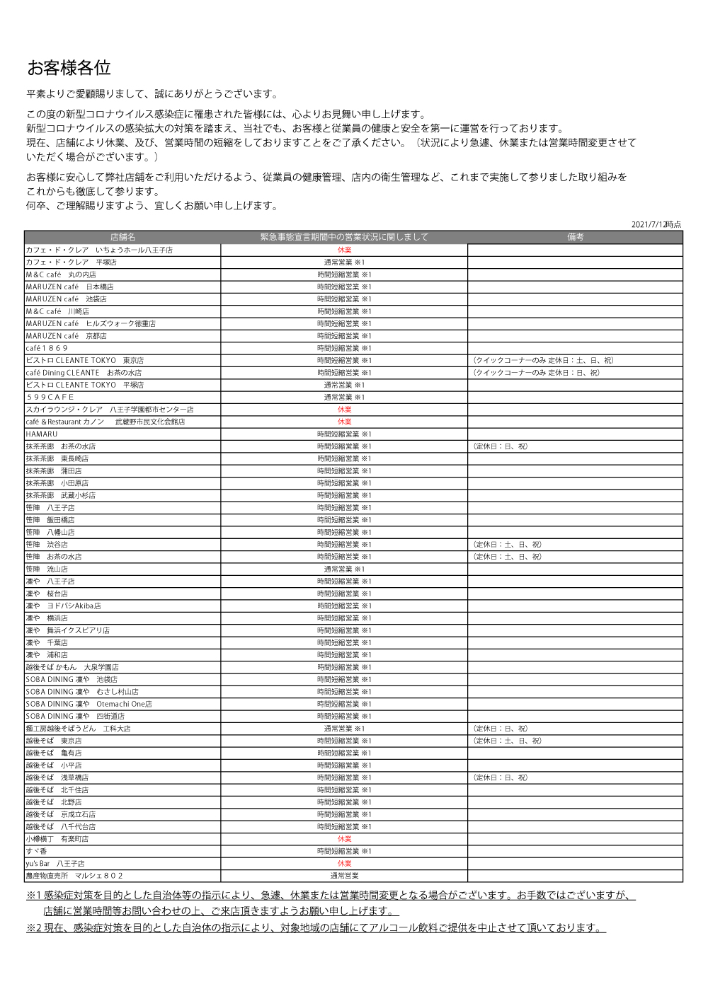 各店営業状況のお知らせ